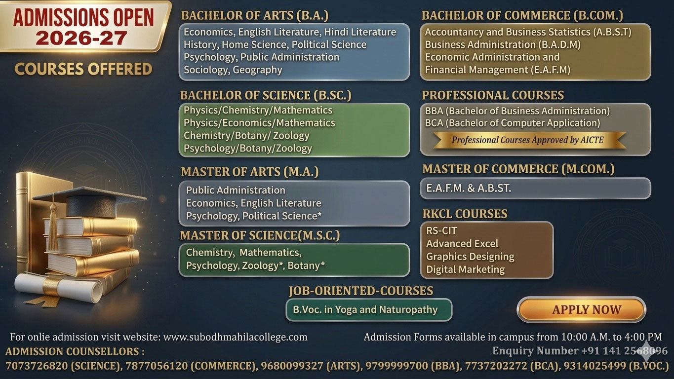 Welcome to S.S. Jain Subodh P.G. Mahila Mahavidyalaya, an esteemed institution, known for its academic excellence and commitment to holistic development of our students. We are deeply committed to women empowerment and our programmes and initiatives aim to empower and uplift women, equipping them with the skills and confidence to succeed in all spheres of life.